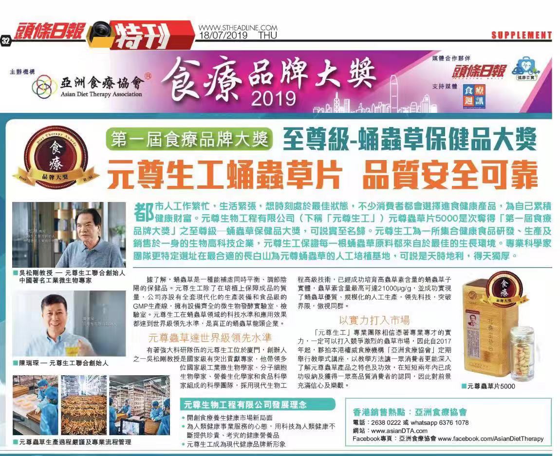 2019年7月26日,元尊虫草片获得香港亚洲食疗协会颁发的“至尊级-蛹虫草保健品大奖”。吴松刚教授及研究院黄博士受邀参与领奖并接受采访。